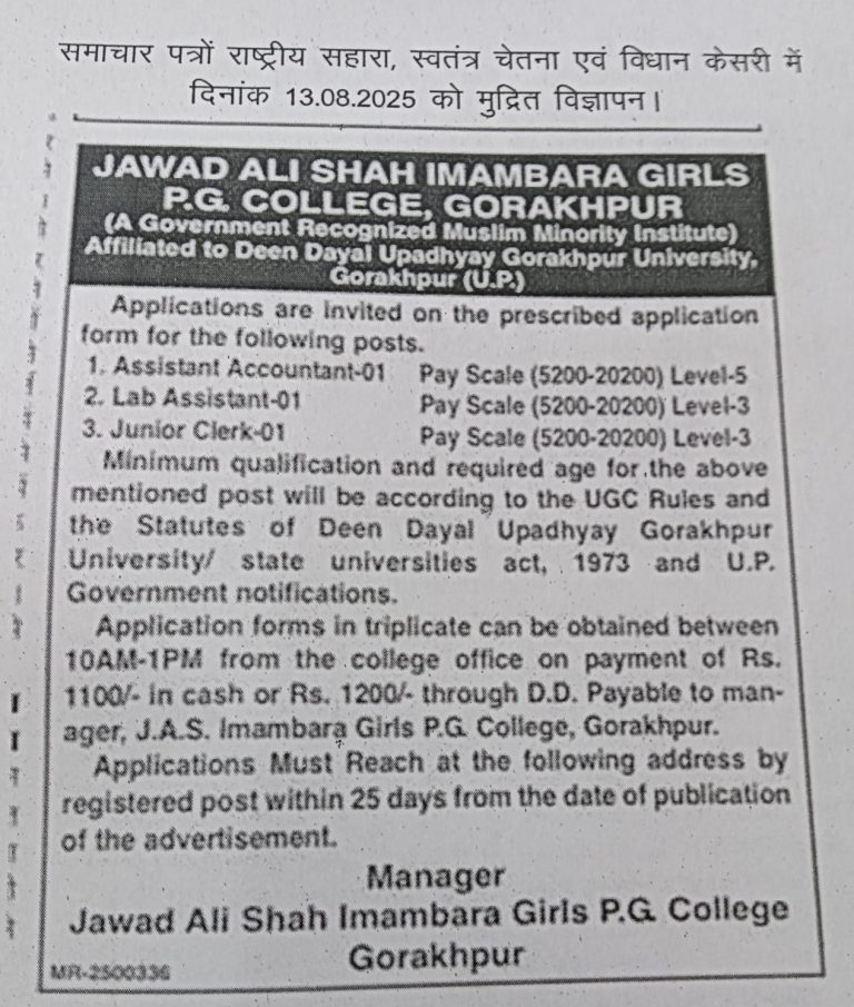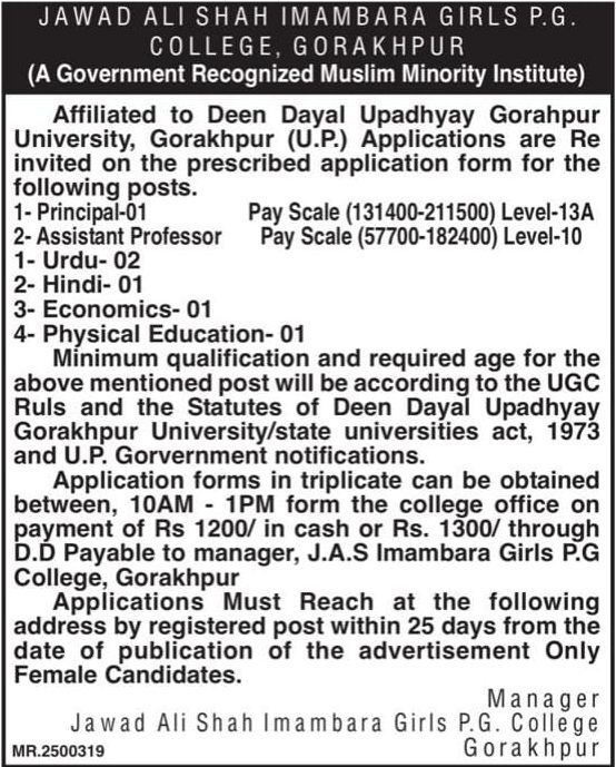 The year 1973 proved a Glorious year for the Muslim minority when Allah, The Almighty inspired Shri Jawad Ali Shah, the then “Mian Saheb” Gorakhpur to contribute in the field of Education. Sri Jawad Ali Shah on one fine morning while sitting with a few of his reliable members of the estate decided to donate a portion of the land from the Imambara Campus for the construction of the building of a girls degree college and also to donate agricultural land of estate to meet out the other needs of the proposed college.